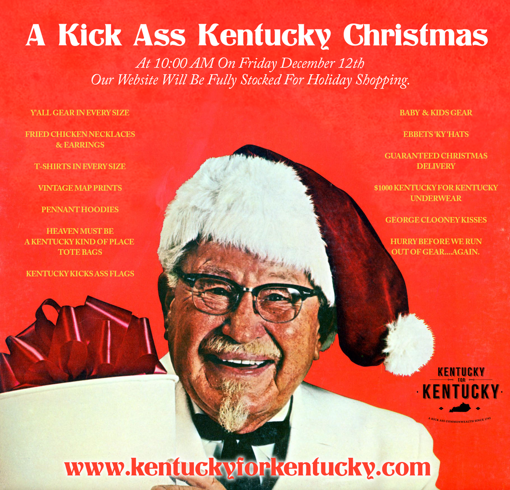 Make it a kick-ass Kentucky Christmas. At 10:00AM this Friday the 12th all of your favorite kick-ass apparel will be back in stock just in time for the holidays! Stuff your stockings with a variety of our most popular gear including Y'ALL t-shirts, Y'ALL baseball raglans and sweatshirts and Heaven Must Be A Kentucky Kind of Place shirts and totes. You can even put some More Bourbon than People shirts and Andrew Jackson shirts under the tree. Stay toastie in our Pennant Hoodie, and keep your kiddos warm in our kids Y'ALL sweatshirt. Kentucky Kicks Ass baseball raglans for kick-ass Kentuckians. Everything will pretty much be back in stock this Friday. Time is of the essence, so get to ordering Friday morning at 10:00AM, and you'll have the most epic Kentucky Christmas ever. You've got until December 19th for guaranteed Christmas delivery, so get to shopping!