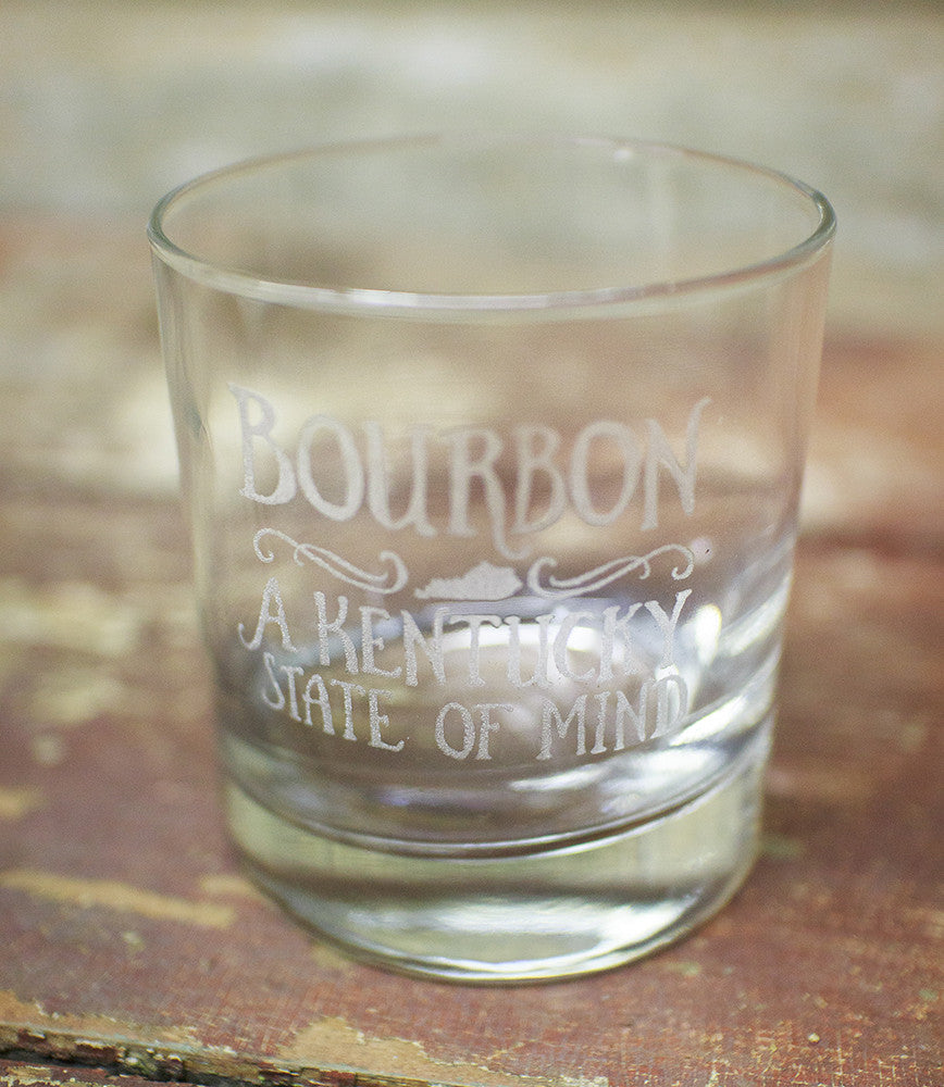 As y'all know, in Kentucky there are more bourbon barrels than there are people. We think that statistic deserves a little something special. That's why we're offering a little something for you bourbon lovers out there. These bourbon glasses were designed and laser-etched by the amazing folks at Cricket Press in Lexington, KY. An essential for those who like to drink America's Native Spirit in style- with "Bourbon" etched on one side and "A Kentucky State of Mind" on the other.