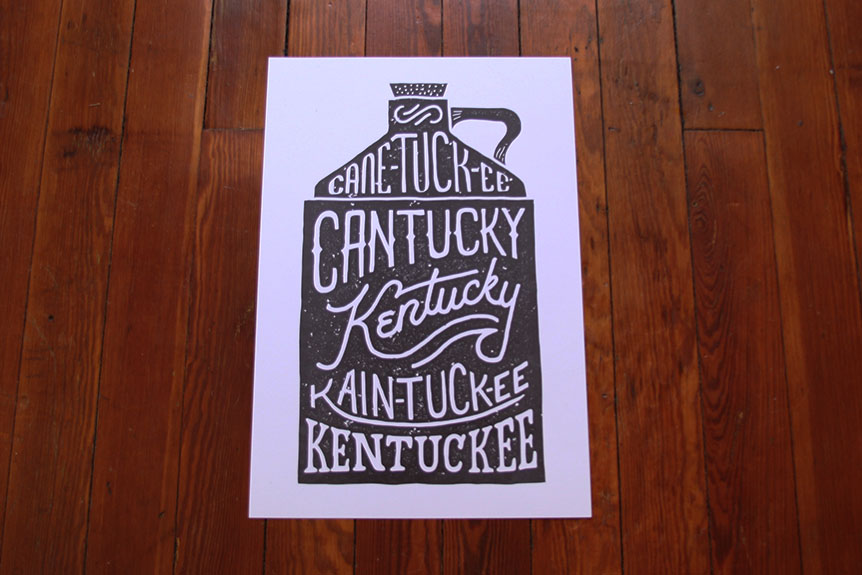For this new round of posters and shirts, we enlisted Jeremy Booth to design our strange and historic spellings of 'Kentucky' into something even more special – in the classic container of a moonshine jug, of course. Booth – of 'Happy Chandler' fame – is a young designer and typographer based out of Louisville. After becoming inspired by the work of Original Makers Club designer Jon Contino, he began exploring hand-lettering and typography, and was encouraged by Over app creator, Aaron Marshall; eventually, Booth created the hand-lettered typeface Goon, which became popular on the app. That's when we discovered Jeremy and he got to work designing typography-oriented prints and t-shirts for us. The enthusiasm of our Kentucky for Kentucky following has given him a huge amount of exposure, pushing his career forward. As Booth enthusiastically informed us, "The success from that collaboration has landed me my first exhibit this year."