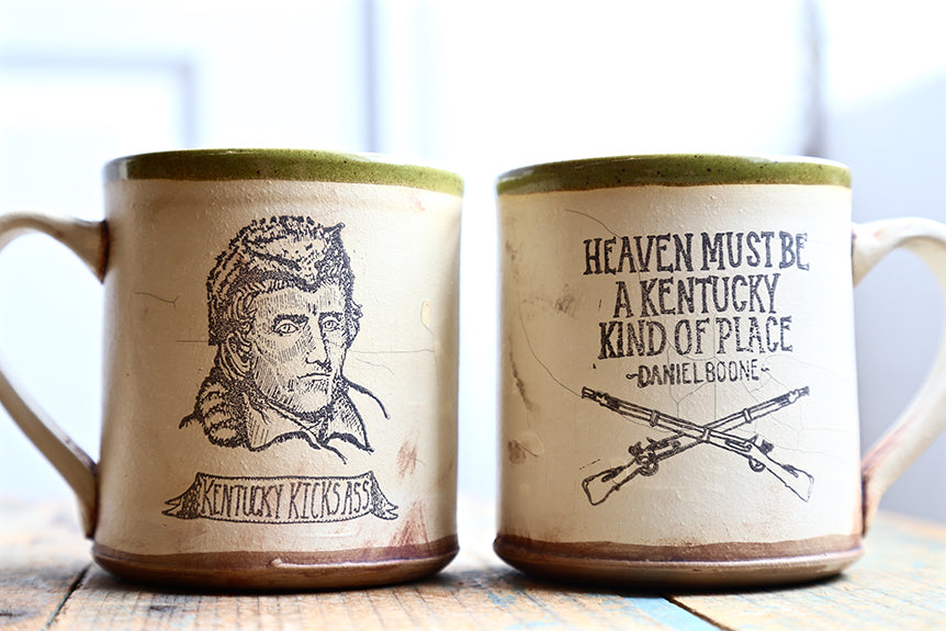 These mugs celebrate Daniel Boone and our love for the beautiful Bluegrass state. Each mug is handmade by one of our favorite local Kentucky potters, David Kenton Kring! One side features a portrait of Daniel Boone in all his rugged glory, and the other a famous quote from the intrepid explorer: "Heaven must be a Kentucky Kind of Place." Hell yeah, y'all! Order your Daniel Boone mug at 10 a.m. this Friday on our website!