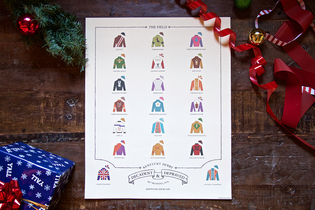 Just in time for Christmas, we're releasing a limited-edition 5th run of our popular "Decadent and Depraved" art prints by Louisville illustrator Rachael Sinclair this Friday, December 8th at 10am! Created exclusively for Kentucky for Kentucky, the design features a striking visual interpretation of Hunter S. Thompson's famous magazine piece, "The Kentucky Derby is Decadent and Depraved." Originally published in the June, 1970 issue of Scanlan's Monthly magazine, Thompson's take on the 96th running of the Kentucky Derby, reported from the trenches along with illustrator Ralph Steadman, depicts a booze-fueled orgy of indulgence and decadence in which the writer ultimately realizes he's played a part. It also introduced the world to Thompson's gonzo style and marked the first time Steadman and Thompson worked together.