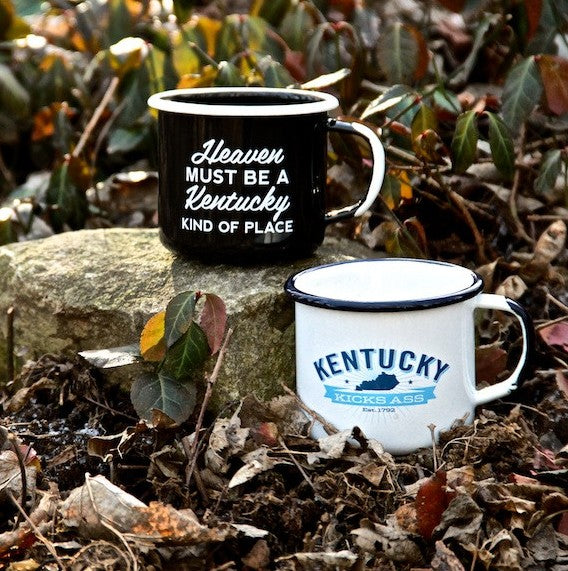 Set of 2 "Heaven Must Be A Kentucky Kind Of Place" steel enamel mugs only $32. "Heaven" design by Tim Jones. A small "Kentucky Kicks Ass" logo can be found on the inside bottom of this mug.