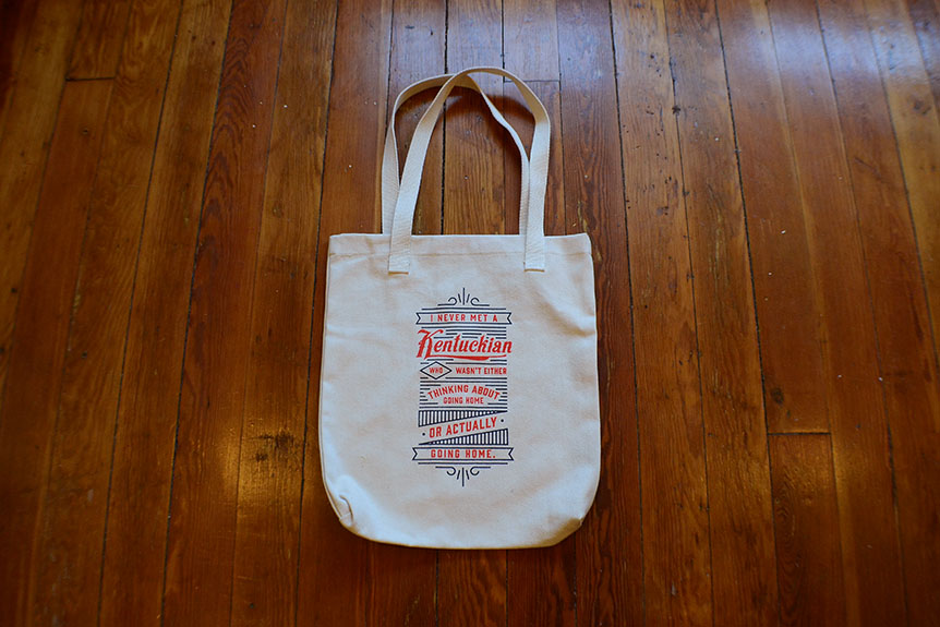This Friday December 20th at 10:30am we're dropping these fresh new 'Happy' tote bags designed by Jeremy Booth. We'll also have more of the 'Heaven Must Be A Kentucky Kind Of Place' tote bags we keep selling out of.