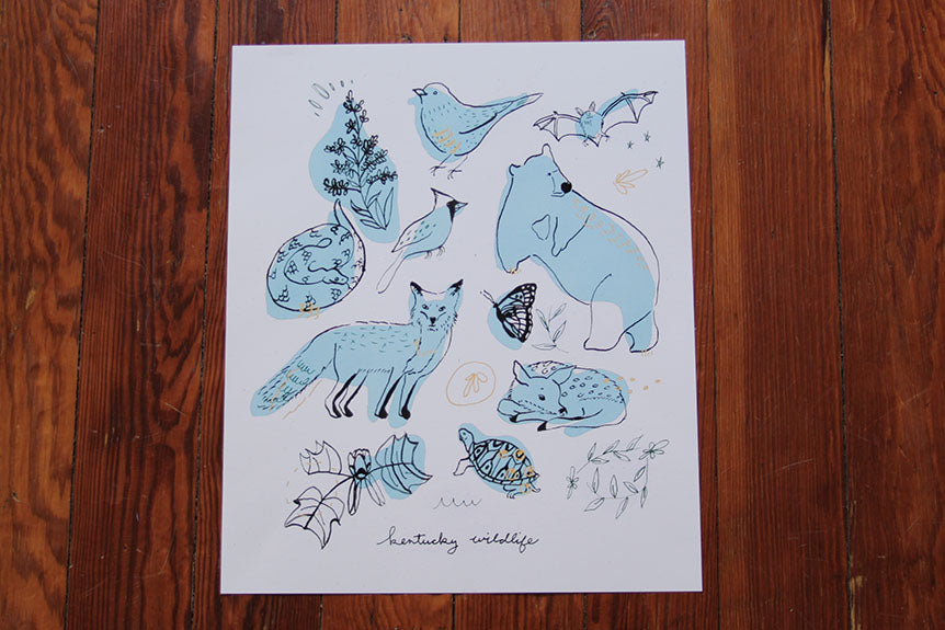 This week, we're launching our "Kentucky Wildlife" print and t-shirt by Kentucky for Kentucky's own June Tate, an artist and writer based in Lexington. June's illustration portrays a selection of sweet, whimsical, native Kentucky favorites straight from the wild. When asked about her process for choosing her subjects, Tate explained, "I did a bit of research on the Kentucky Department of Fish and Wildlife site to find a list of animals found in Kentucky. I tried to pick a diverse crew of critters. My favorite little animal on the design is the bat because his facial expression is truly happy and earnest." June's print includes a range of regional plants and animals – a Kentucky Warbler, Cardinal, Copperhead snake, Red Fox, Deer, Black Bear, Painted Turtle, Monarch Butterfly, Gray Bat, Goldenrod, and Tulip Poplar.