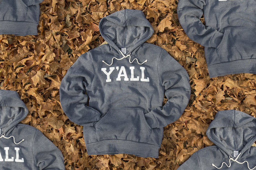 Y'all asked for it, y'all got it! Hoodie weather is upon us! This Friday, November 4th at 10 am we're launching Y'ALL hoodies! These heather navy blue super soft hooded sweatshirts are just what you need to Y'ALL out this Fall! Wear it on a brisk fall day! Wear it and you won't lose your hat or gloves! Wear it to class with pajama bottoms and your hair in a scrunchie! Wear it backwards and fill the hood with popcorn for a convenient snack holder! The possibilities are limitless. Get you one. Available at the online shop this Friday!