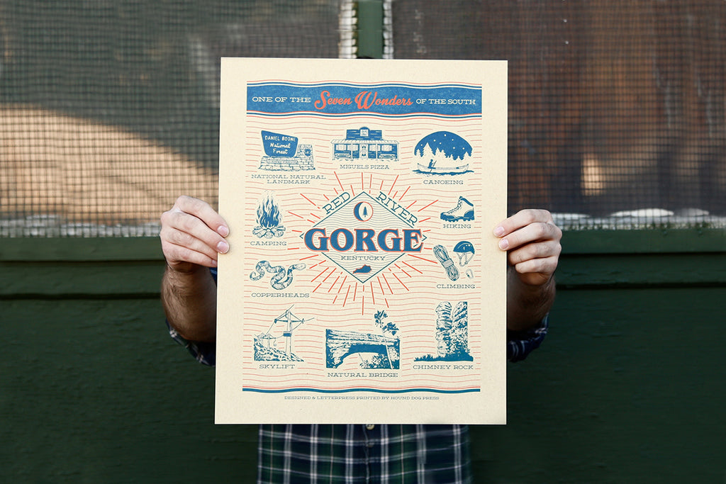 For those of you that love the Red River Gorge as much as we do, you're in luck! Our good friends at Hound Dog Press are bringing back these kick-ass prints celebrating Kentucky's beloved 'Red River Gorge' that will be available for purchase this Wednesday, November 16th at 10am on our website. These amazing 13″x16.5″ prints were designed by Hound Dog's Robert Ronk and printed the old fashioned way at their studio in Louisville, KY. Only a limited quantity of these prints will be available, so act fast, y'all!