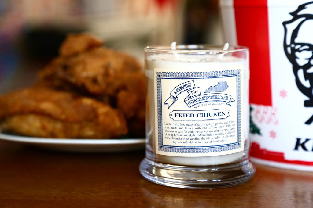 We're excited to announce our 'Scents Of The Commonwealth' candles are back in action, y'all! And just in time for the holidays! Once again we've collaborated with Kentucky's most prolific candle maker, Kathy Werking, and Rachael Sinclair, designer of these candle labels, to bring you these five awesome Kentucky scented soy wax candles; Bourbon Ball candle, Cornbread (NEW), Burning Couch (NEW), Mint Julep candle, and our world famous Fried Chicken candle. All available this Wednesday, November 22nd at 10AM on our website. Give your out-of-state Kentuckians the scents of home for the holidays.