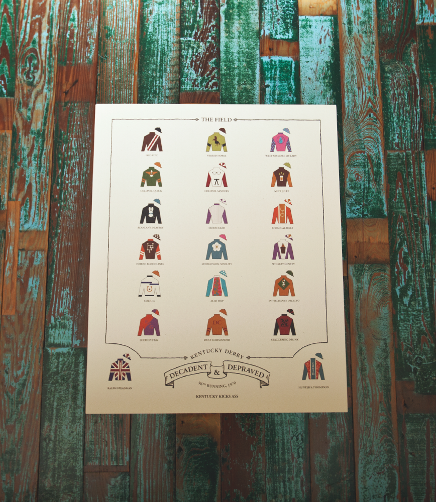 You'll notice each silk on this print is symbolic of something from Hunter S. Thompson's essay – Colonel Quick, Nekkid Horses, Whiskey Gentry, Dust Commander, Old Fitz, Chemical Billy, Inbred Horses, etc. Good stuff.