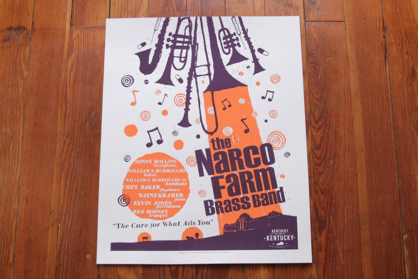 This week we're mining the legacy of "The Narco Farm," a Lexington legend that housed many greats – including Sonny Rollins, William S. Burroughs, Chet Baker, Wayne Kramer, Elivn Jones, and Red Rodney – that we've rounded up together in a dream team version of "the Narco Farm Brass Band." This summer, we're celebrating with a hand-pulled print that's exclusively designed, signed, and numbered by Cricket Press for Kentucky for Kentucky. Before you snag 'the cure for what ails you,' let us give you a little dose of history to get your head right.