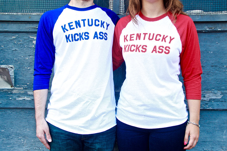 Kentuckians. We might not be able to reach an agreement when it comes to our favorite colors, but we can sure agree on one thing: Kentucky kicks ass, indeed! These new Kentucky Kicks Ass baseball tees express the one thing we all have in common. We know Kentucky Kicks Ass, and we want the world to know! Find your red or blue Kentucky Kicks Ass raglan baseball t-shirt on our website this Friday, July 24th and 10AM! Designed by Rachael Sinclair.