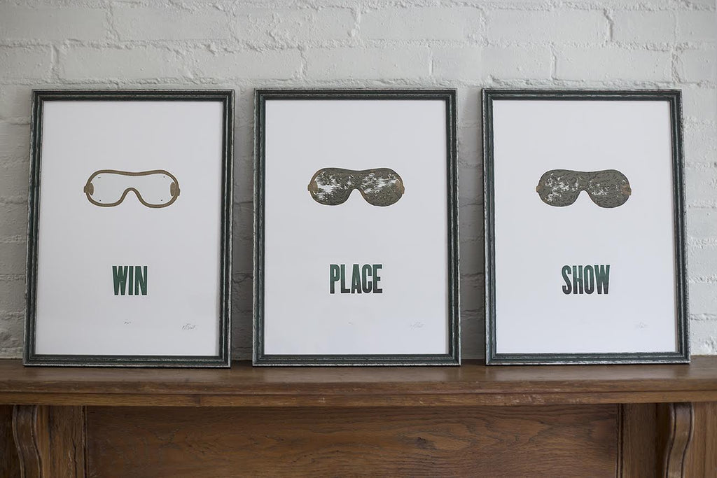 Nothing says "Kentucky" quite like a good horse race, y'all! We're looking ahead to warmer days with this new 3-print series "Win, Place, Show" by our pal Nick Baute at Hound Dog Press on 13″x18″ paper! Hand-printed the old fashioned way out of Louisville, KY. This Wednesday, January 11th at 10am a very limited quantity of these prints will be available for purchase on our website! These uniquely kick-ass prints are gonna go faster than American Pharaoh, y'all, so be ready to order yours this Wednesday at 10am!
