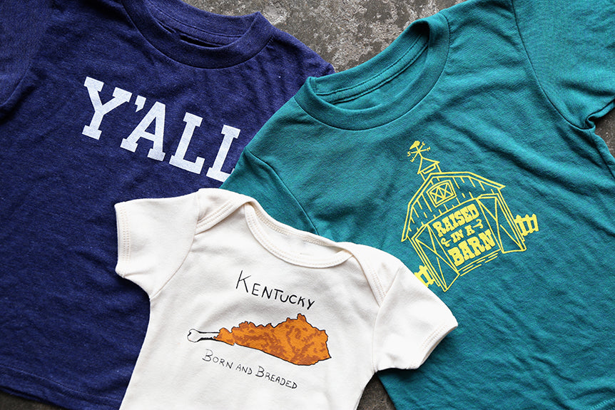 Kentucky kids are the best, y'all! This Friday, August 19th, at 10 a.m. we'll be restocking all of our kids' gear, including a couple new additions to the selection! We'll have our "Y'ALL" tees and onesies, "Born and Breaded" tees and onesies, Kentucky Kicks Ass onesies, and new "Scenic Kentucky" and "Raised In a Barn" tees! Every Kentucky kid needs one, y'all, and ain't no time like the present. Head on over to the shop to place your order, beginning at 10 a.m. Friday, and read about essential knowledge Kentucky kids grow up knowing here!